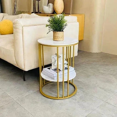 Add a touch of sophistication to your living space with the Lynton Two-Tier Sofa Side Table. Featuring a sleek design, this table is crafted with a sturdy wrought iron frame finished in glossy gold and topped with premium White Italian Nano Marble. Its two-tier structure provides ample space for displaying decor items, books, or beverages, making it both functional and stylish.