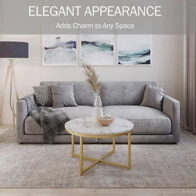 Elevate the elegance of your living room with the Middlebrook Cross Base Coffee Table, a perfect blend of modern design and luxurious aesthetics. Featuring a striking criss-cross gold metal base and a sleek white Italian Nano Marble top, this table adds sophistication to any space. Its compact round design makes it ideal for smaller areas while providing ample surface area for decor, beverages, or books.
